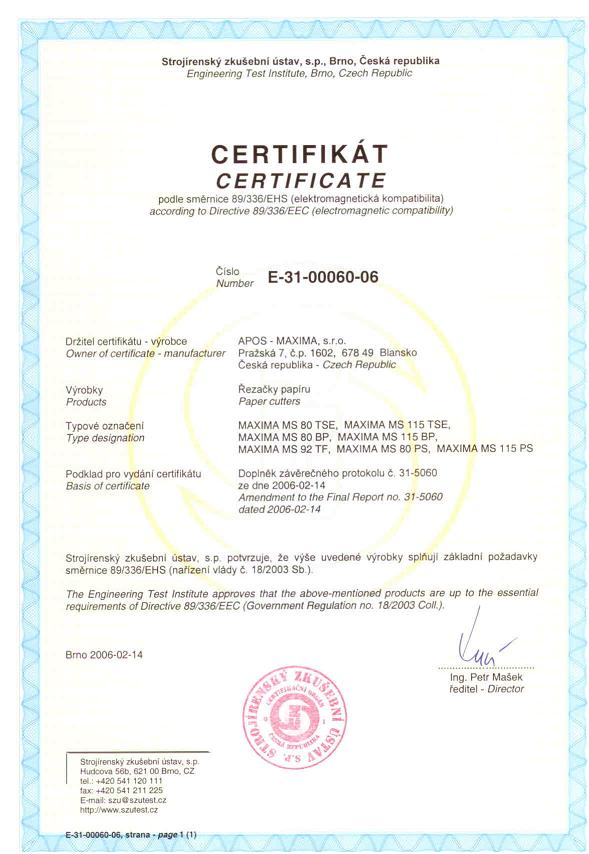 Certifikát Strojírenského zkušebního ústavu, s.p.