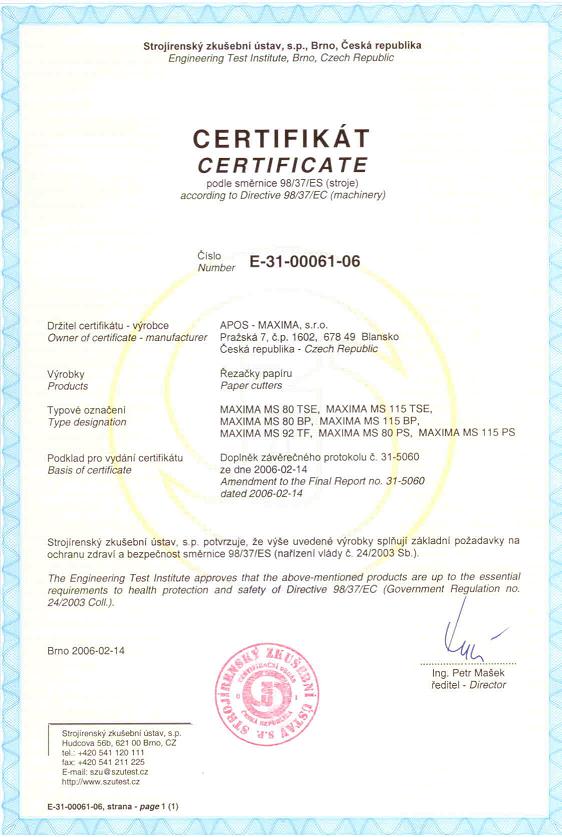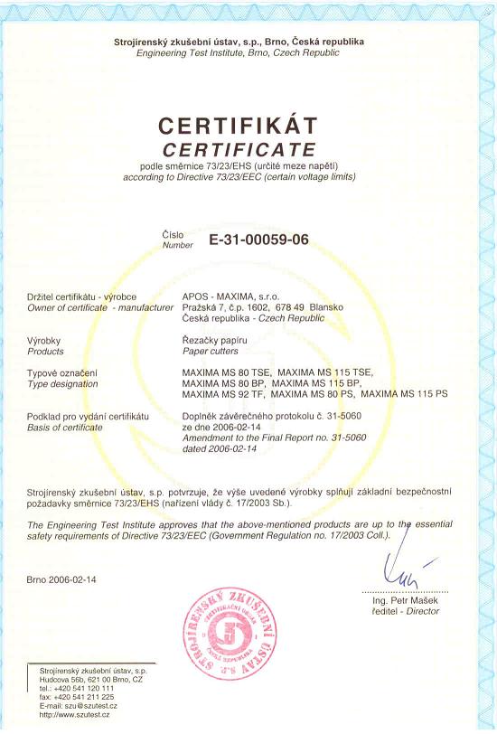 Certifikát Strojírenského zkušebního ústavu, s.p.